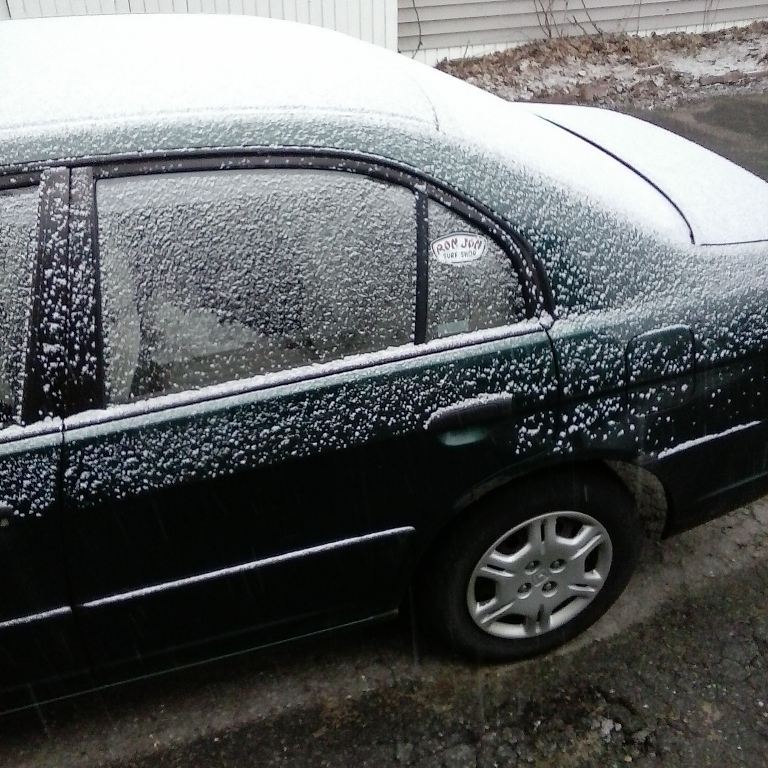 I awoke today to this snowy scene, and the snow lasted a good part of the day, with about an inch of accumulation on cold surfaces (my car and the steps).